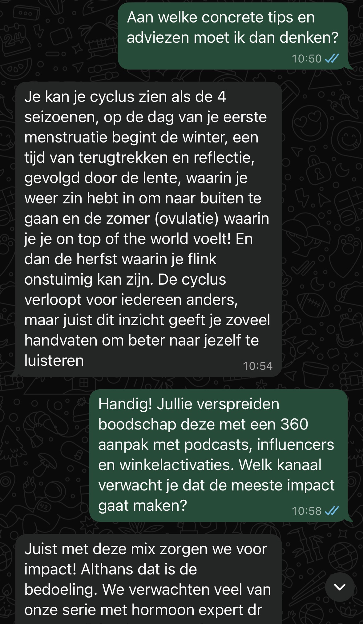 Juist met deze mix zorgen we voor impact! Althans dat is de bedoeling. We verwachten veel van onze serie met hormoon expert dr Annemarieke doornweerd op youtube, die worden ontzettend goed bekeken, verder hebben we een mooie samenwerking met LINDA, waarbij je ook de hormoonwijzer kan krijgen. En daarnaast zijn onze winkels ontzettend belangrijk, want daar krijg je het persoonlijk advies.
