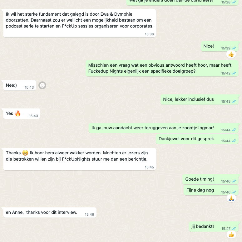 Ik wil het sterke fundament dat gelegd is door Ewa & Dymphie doorzetten. Daarnaast zou er wellicht een mogelijkheid bestaan om een podcast serie te starten en F*ckUp sessies organiseren voor corporates.