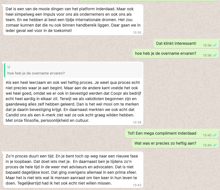 Als een heel leerzaam en ook wel heftig proces. Je weet qua proces echt niet precies waar je aan begint. Maar aan de andere kant voelde het ook wel heel goed, omdat we er ook in bevestigd werden dat Coopr als bedrijf echt heel aardig in elkaar zit. Terwijl we als vakidioten begonnen zijn en gaandeweg alles zelf hebben geleerd. Dan is het wel mooi om te merken dat je daarin bevestiging krijgt. En daarnaast merkten we ook echt dat Candid ons als een A-merk ziet wat ze ook echt graag wilden hebben. Met onze filosofie, persoonlijkheid en cultuur.