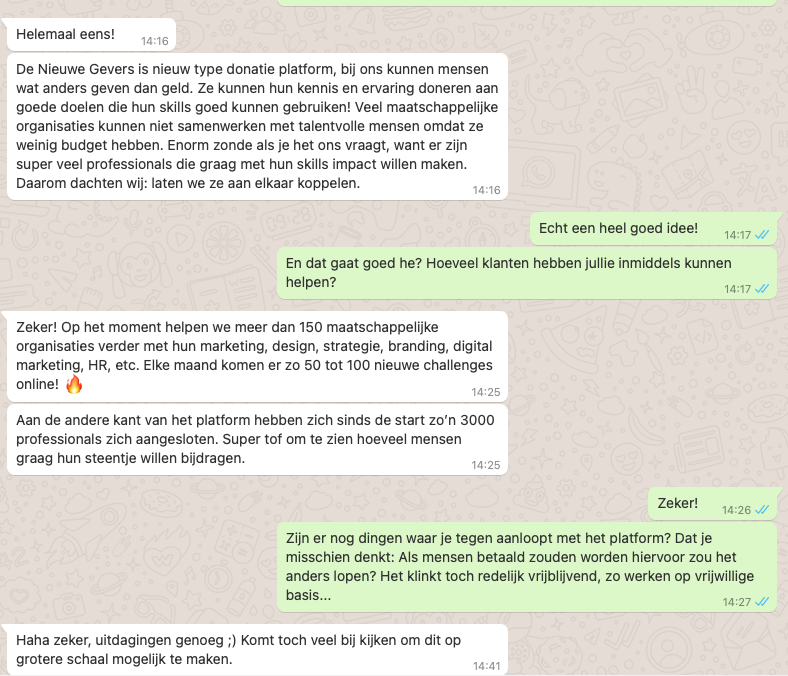 De Nieuwe Gevers is nieuw type donatie platform, bij ons kunnen mensen wat anders geven dan geld. Ze kunnen hun kennis en ervaring doneren aan goede doelen die hun skills goed kunnen gebruiken! Veel maatschappelijke organisaties kunnen niet samenwerken met talentvolle mensen omdat ze weinig budget hebben. Enorm zonde als je het ons vraagt, want er zijn super veel professionals die graag met hun skills impact willen maken. Daarom dachten wij: laten we ze aan elkaar koppelen.