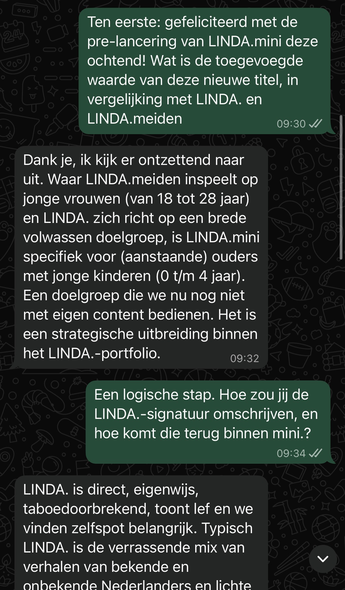 Dank je, ik kijk er ontzettend naar uit. Waar LINDA.meiden inspeelt op jonge vrouwen (van 18 tot 28 jaar) en LINDA. zich richt op een brede volwassen doelgroep, is LINDA.mini specifiek voor (aanstaande) ouders met jonge kinderen (0 t/m 4 jaar). Een doelgroep die we nu nog niet met eigen content bedienen. Het is een strategische uitbreiding binnen het LINDA.-portfolio.