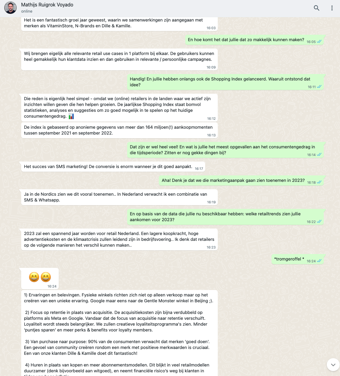 Internationaal CXP-platform Voyado opende vorig jaar een kantoor in Amsterdam. Sindsdien hebben ze flinke groei meegemaakt om merken te helpen hun customer experience naar een hoger level te tillen. Voyado heeft inmiddels veel data over consumentengedrag en lanceerde daarmee de Shopping Index. We appten met Mathijs Ruigrok - baas van de Nederlandse tak van Voyado - over de inzichten uit de Shopping Index en de retailtrends voor 2023.