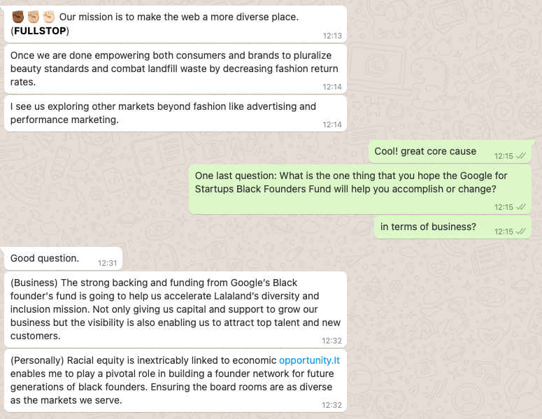 (Business) The strong backing and funding from Google’s Black founder's fund is going to help us accelerate Lalaland’s diversity and inclusion mission. Not only giving us capital and support to grow our business but the visibility is also enabling us to attract top talent and new customers.