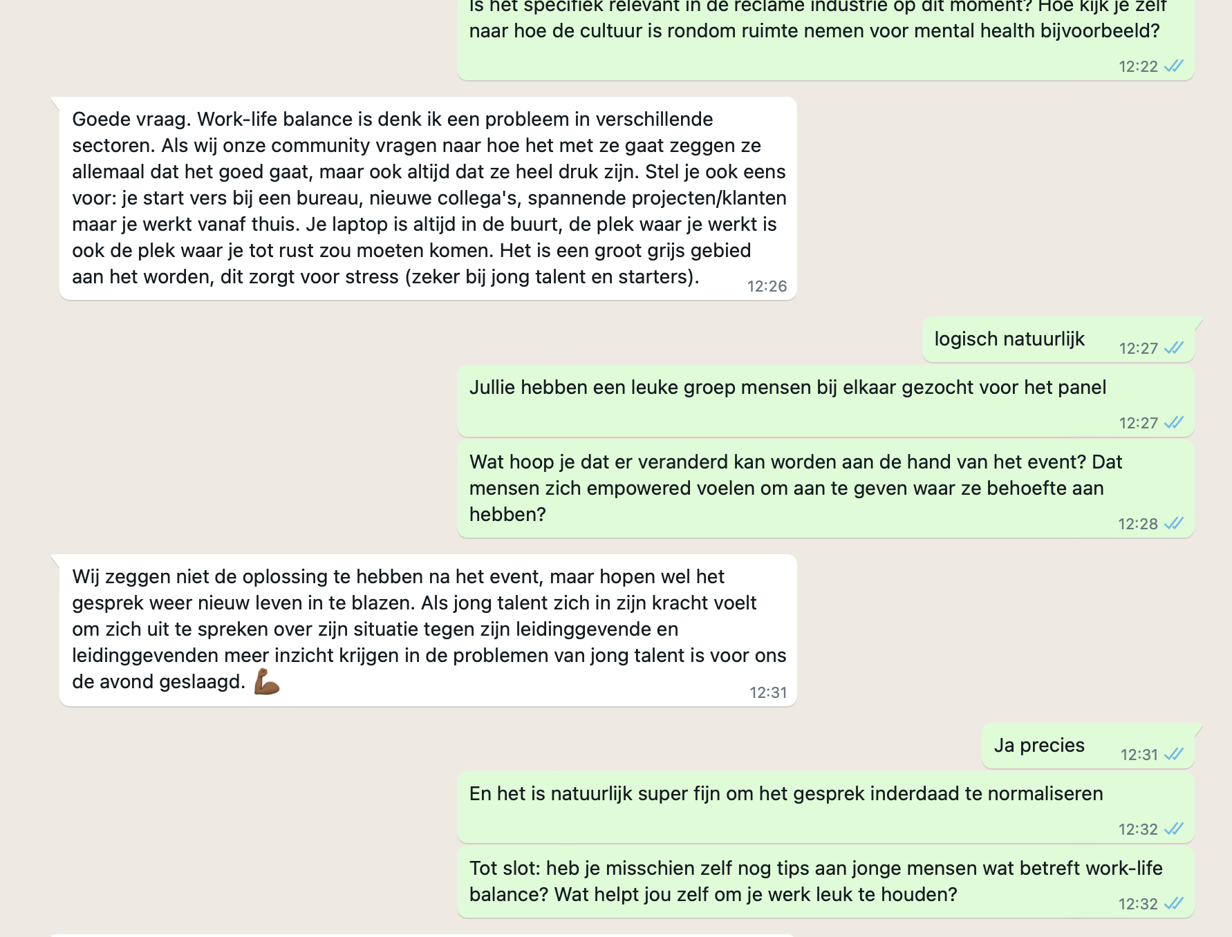Goede vraag. Work-life balance is denk ik een probleem in verschillende sectoren. Als wij onze community vragen naar hoe het met ze gaat zeggen ze allemaal dat het goed gaat, maar ook altijd dat ze heel druk zijn. Stel je ook eens voor: je start vers bij een bureau, nieuwe collega's, spannende projecten/klanten maar je werkt vanaf thuis. Je laptop is altijd in de buurt, de plek waar je werkt is ook de plek waar je tot rust zou moeten komen. Het is een groot grijs gebied aan het worden, dit zorgt voor stress (zeker bij jong talent en starters).