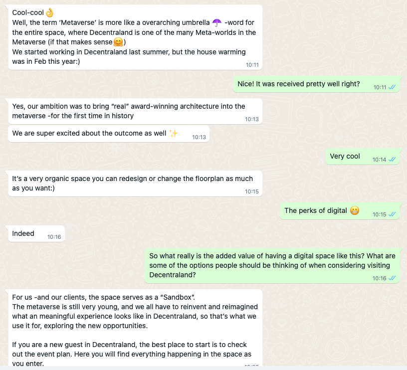 The metaverse is still very young, and we all have to reinvent and reimagined what an meaningful experience looks like in Decentraland, so that’s what we use it for, exploring the new opportunities.