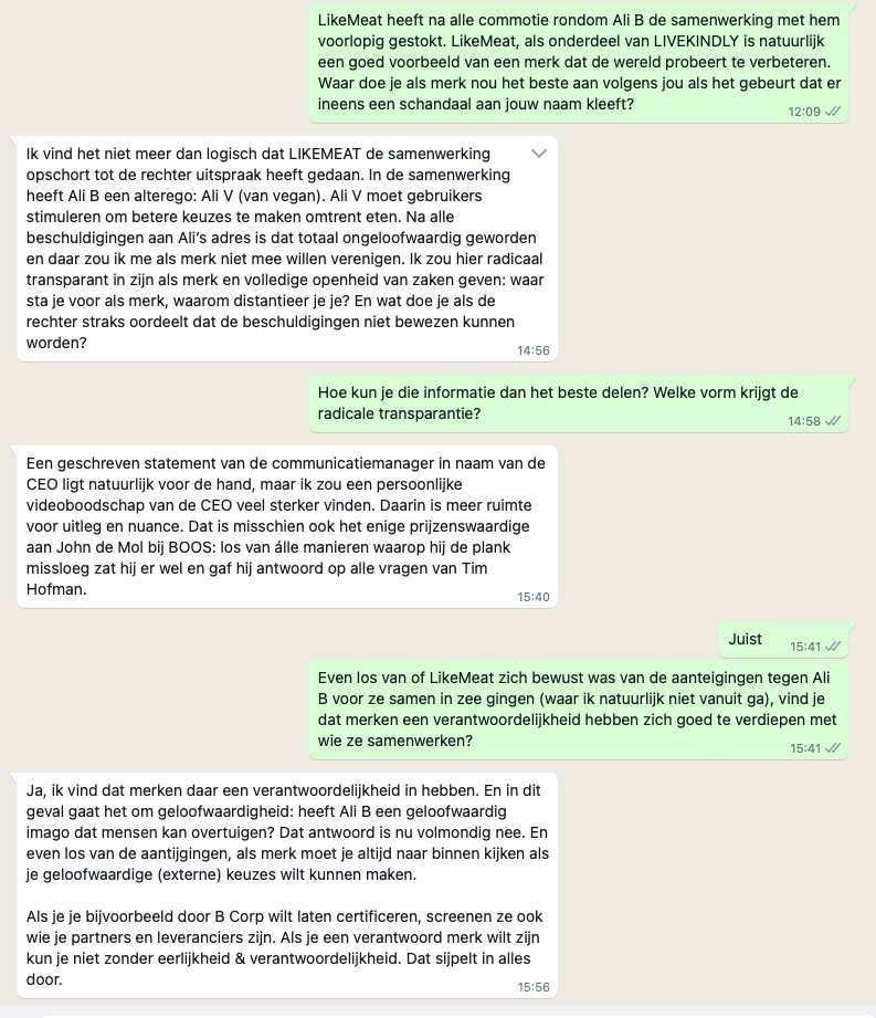 Ik vind het niet meer dan logisch dat LIKEMEAT de samenwerking opschort tot de rechter uitspraak heeft gedaan. In de samenwerking heeft Ali B een alterego: Ali V (van vegan). Ali V moet gebruikers stimuleren om betere keuzes te maken omtrent eten. Na alle beschuldigingen aan Ali’s adres is dat totaal ongeloofwaardig geworden en daar zou ik me als merk niet mee willen verenigen. Ik zou hier radicaal transparant in zijn als merk en volledige openheid van zaken geven: waar sta je voor als merk, waarom distantieer je je? En wat doe je als de rechter straks oordeelt dat de beschuldigingen niet bewezen kunnen worden?