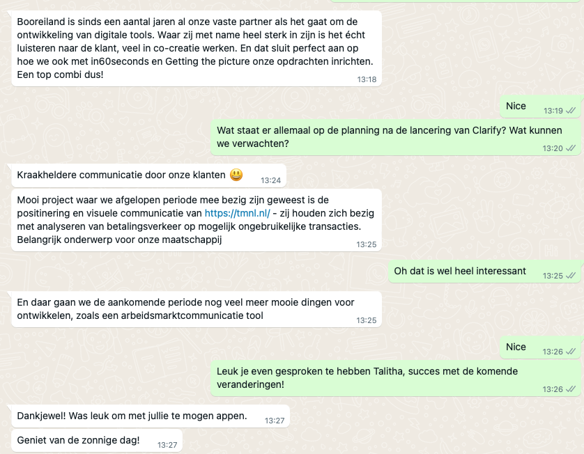 Booreiland is sinds een aantal jaren al onze vaste partner als het gaat om de ontwikkeling van digitale tools. Waar zij met name heel sterk in zijn is het écht luisteren naar de klant, veel in co-creatie werken. En dat sluit perfect aan op hoe we ook met in60seconds en Getting the picture onze opdrachten inrichten. Een top combi dus!