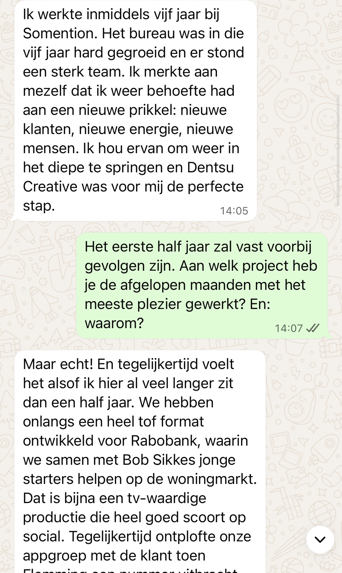 Ik werkte inmiddels vijf jaar bij Somention. Het bureau was in die vijf jaar hard gegroeid en er stond een sterk team. Ik merkte aan mezelf dat ik weer behoefte had aan een nieuwe prikkel: nieuwe klanten, nieuwe energie, nieuwe mensen. Ik hou ervan om weer in het diepe te springen en Dentsu Creative was voor mij de perfecte stap.