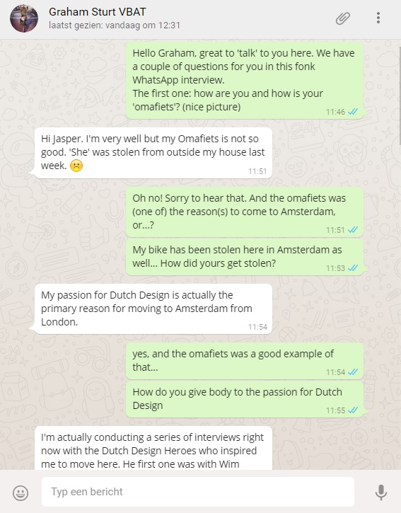 Hello Graham, leuk om met te 'praten'. We hebben een paar vragen voor je in een fonk WhatsApp-interview. De eerste vraag: hoe gaat het met je en hoe is het met je 'omafiets'? (leuke foto heb je)‘Hi Jasper. Het gaat heel goed met me, maar minder met mijn Omafiets. 'Ze' is gestolen vorige week.’ :(