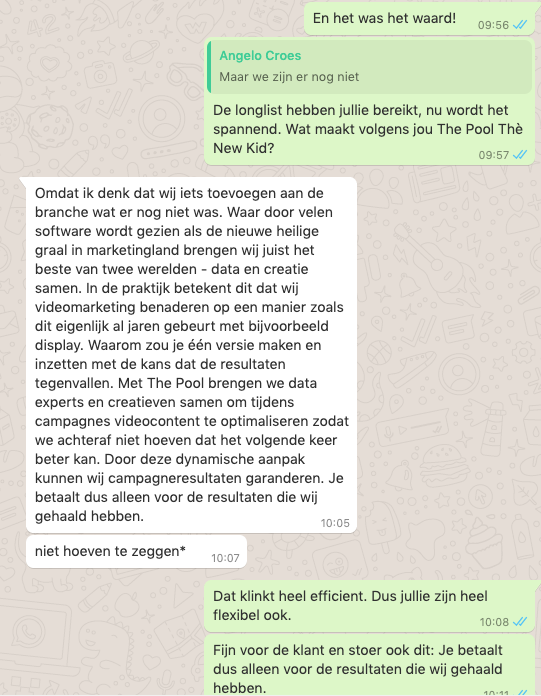 Omdat ik denk dat wij iets toevoegen aan de branche wat er nog niet was. Waar door velen software wordt gezien als de nieuwe heilige graal in marketingland brengen wij juist het beste van twee werelden - data en creatie samen. In de praktijk betekent dit dat wij videomarketing benaderen op een manier zoals dit eigenlijk al jaren gebeurt met bijvoorbeeld display. Waarom zou je één versie maken en inzetten met de kans dat de resultaten tegenvallen. Met The Pool brengen we data experts en creatieven samen om tijdens campagnes videocontent te optimaliseren zodat we achteraf niet hoeven te zeggen dat het volgende keer beter kan. Door deze dynamische aanpak kunnen wij campagneresultaten garanderen. Je betaalt dus alleen voor de resultaten die wij gehaald hebben.