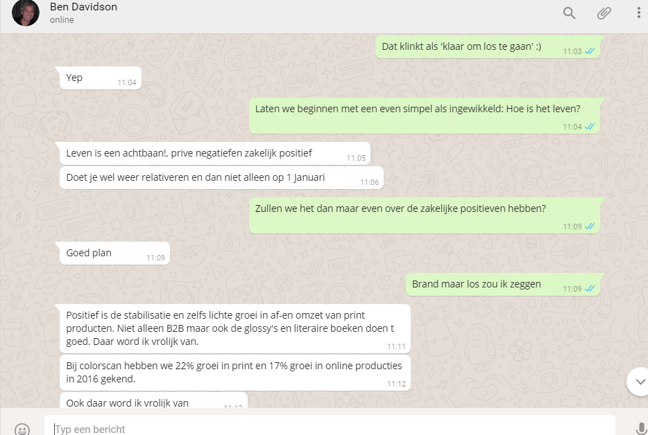 Vandaag Whatsappen we met Ben Davidson, de goedgemutste (vandaag in ieder geval) oprichter van Colorscan. Hij sprak met ons onder meer over de actuele ontwikkeling van print en digitaal èn over de (bescheiden) groei die print laat zien. Waarom een aantal uitgevers de boot mist, legt Ben haarfijn uit.