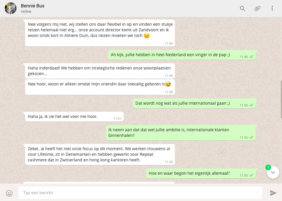 Ik neem aan dat dat wel jullie ambitie is, internationale klanten binnenhalen?Zeker, al heeft het niet onze focus op dit moment. We werken trouwens al voor Lifetime, zit in Denemarken en hebben gewerkt voor Repeat Cashmere dat in Zwitserland en Hong Kong kantoren heeft.