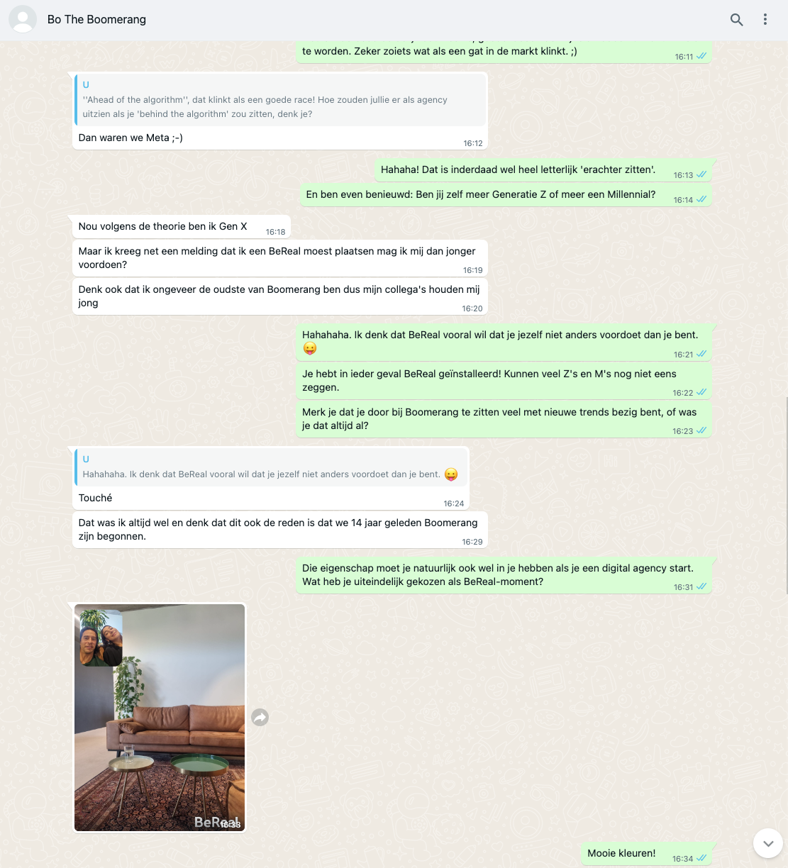 Hahahaha. Ik denk dat BeReal vooral wil dat je jezelf niet anders voordoet dan je bent. Je hebt in ieder geval BeReal geïnstalleerd! Kunnen veel Z's en M's nog niet eens zeggen.Merk je dat je door bij Boomerang te zitten veel met nieuwe trends bezig bent, of was je dat altijd al?