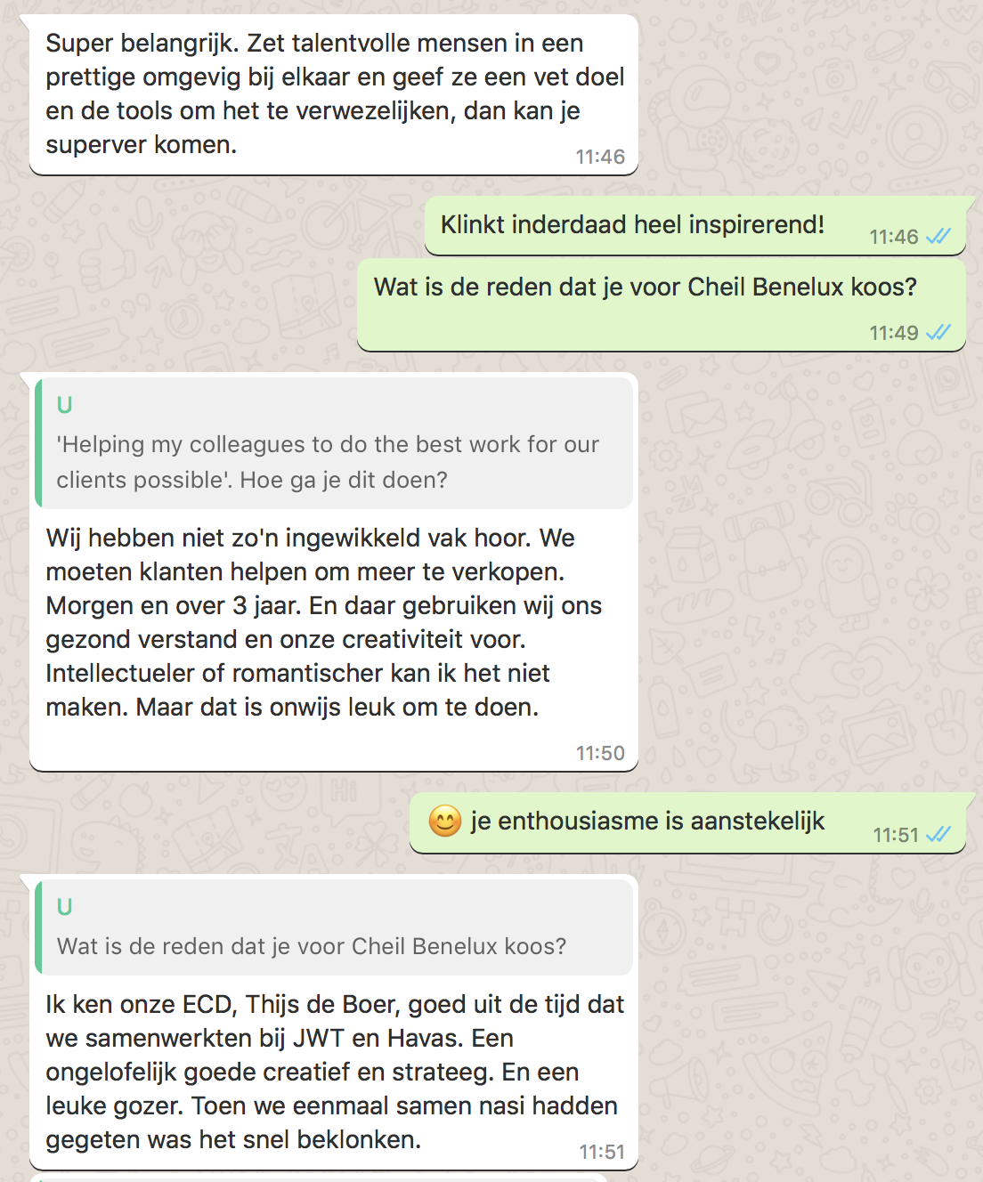 Ik ken onze ECD, Thijs de Boer, goed uit de tijd dat we samenwerkten bij JWT en Havas. Een ongelofelijk goede creatief en strateeg. En een leuke gozer. Toen we eenmaal samen nasi hadden gegeten was het snel beklonken.