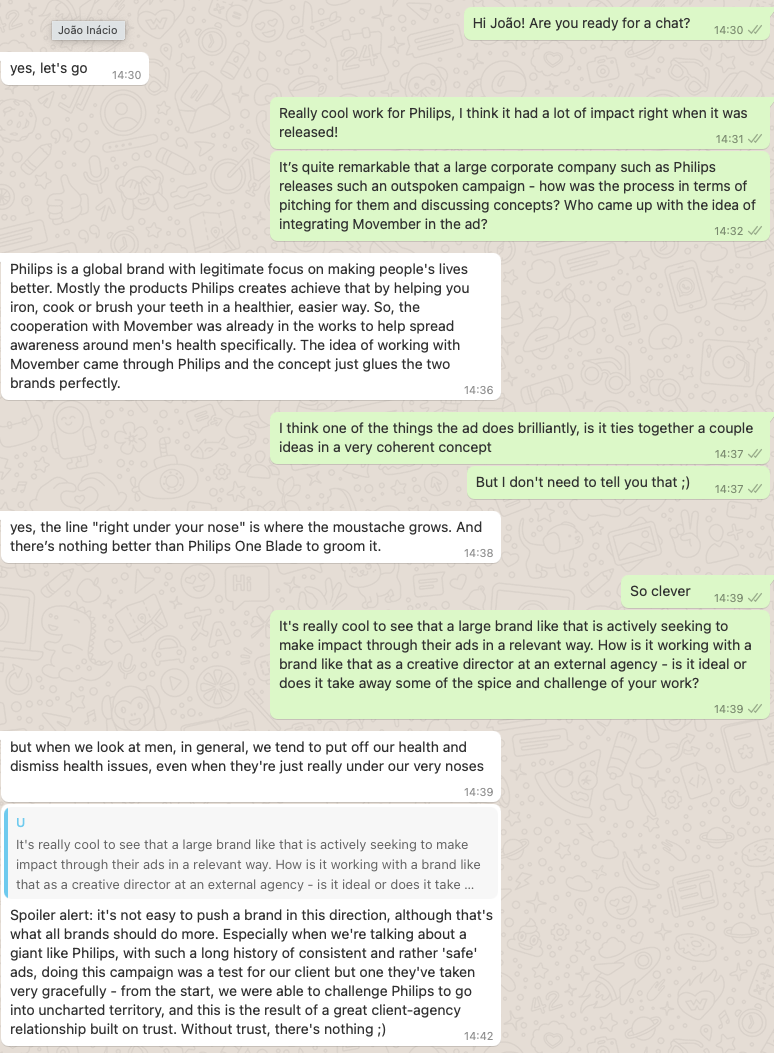 It’s quite remarkable that a large corporate company such as Philips releases such an outspoken campaign - how was the process in terms of pitching for them and discussing concepts? Who came up with the idea of integrating Movember in the ad?
