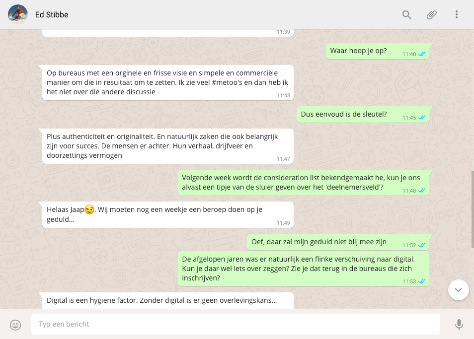 Deze week wordt de definitieve considerationlist voor de SAN New Kids On The Block bekendgemaakt. Voor veel bureaus een spannende tijd, maar ook voor de coaches die de jonge bureaus gaan begeleiden in het proces. Nieuw in het team coaches is Ed Stibbe, dus een goede gelegenheid om hem de kleren van het lijf te vragen via de WhatsApp.