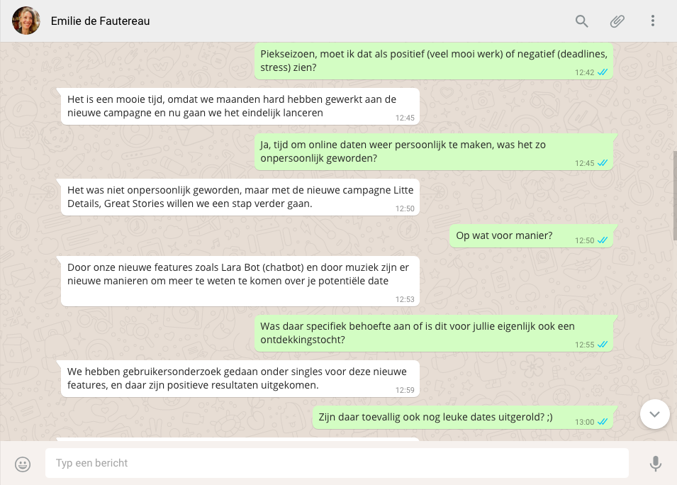 Ja, tijd om online daten weer persoonlijk te maken, was het zo onpersoonlijk geworden?Het was niet onpersoonlijk geworden, maar met de nieuwe campagne Litte Details, Great Stories willen we een stap verder gaan.