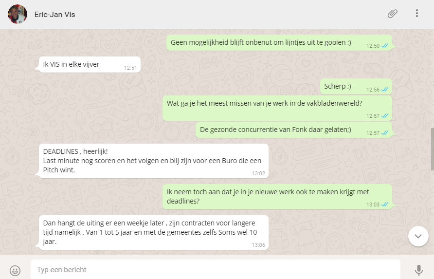 Na een decennialange carrière in de vakbladenwereld is het tijd voor wat anders voor Eric-Jan Vis. Fonk’s afzwaaiend concurrent gaat zich focussen op een carrière in de buitenreclame. Onlangs gaf hij aan de overstap te maken naar NPB Media. Reden voor ons om hem te onderwerpen aan een WhatsAppinterview.
