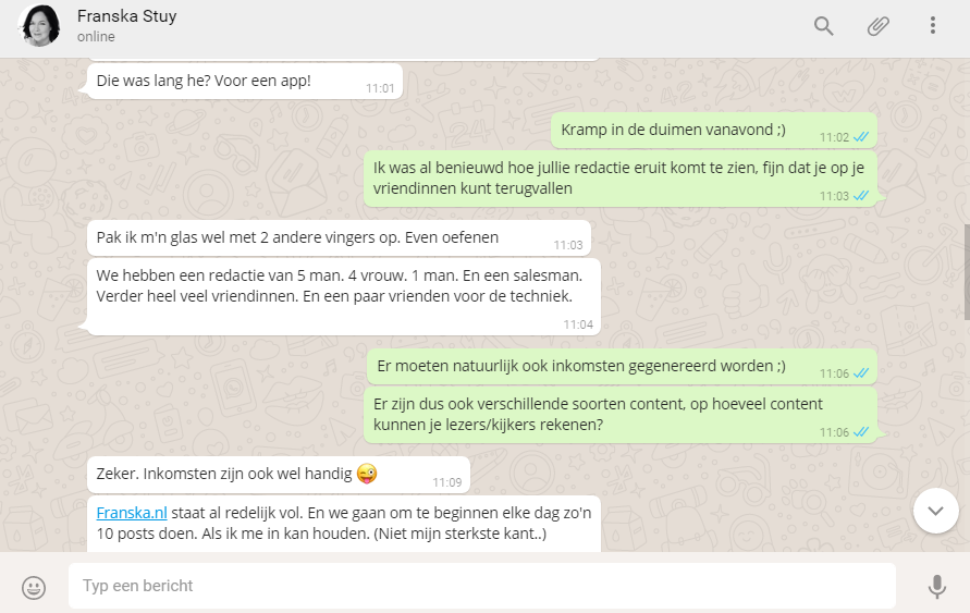 Haha...Ik kan niet stilzitten. Ik zit trouwens intussen lekker met Sven, de art director aan franska.nl te klussen. Handig zo'n wapp-interview.