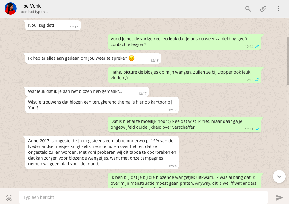 Ik ben blij dat je bij die blozende wangetjes uitkwam, ik was al bang dat ik over mijn menstruatie moest gaan praten. Anyway, dit is wel ff wat anders dan duurzame flesjes hè?Hahahaha, geen zorgen Jaap! Yoni is inderdaad heel wat anders. Maar wel weer een perfecte combinatie van een topproduct waarmee wij een maatschappelijk probleem willen oplossen. Naast het opheffen van het taboe rondom menstruatie proberen wij ook de fem care industrie te veranderen. Elke vrouw wil tenslotte weten waar haar meest intieme producten van gemaakt zijn.