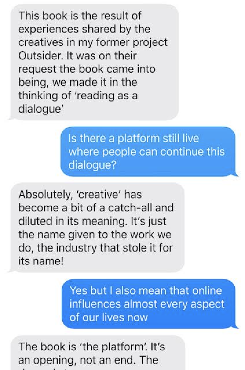 This book is the result of experiences shared by the creatives in my former project Outsider. It was on their request the book came into being, we made it in the thinking of ‘reading as a dialogue’. The book is ‘the platform’. It’s an opening, not an end. The dream is to spur on conversations between people, friends, collaborators, conspirators