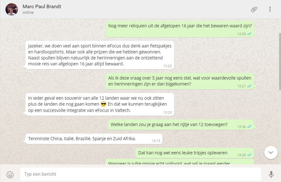 Ha Marc-Paul (met tussenstreepje toch?), leuk dat je mee wilt werken aan een WhatsApp interview. Heb je momenteel tijd beschikbaar?