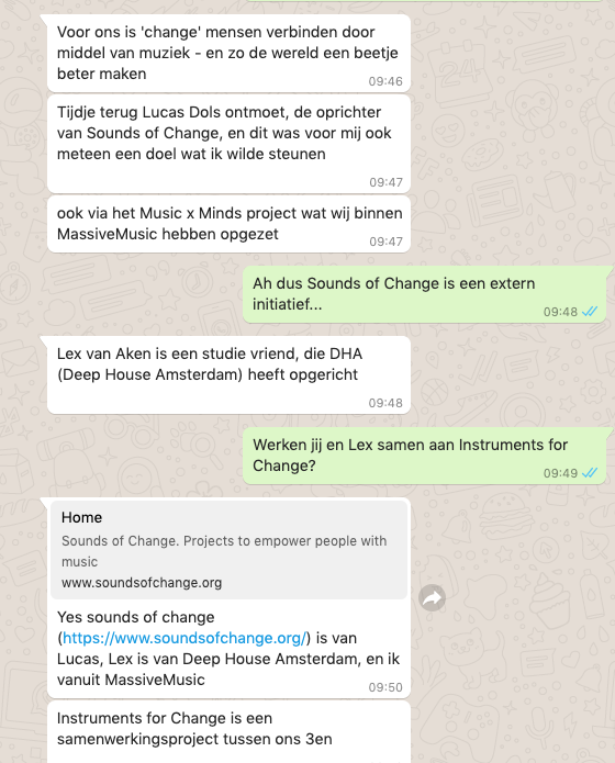 Lex van Aken is een studie vriend, die DHA (Deep House Amsterdam) heeft opgericht. Sounds of change is van Lucas, Lex is van Deep House Amsterdam, en ik vanuit MassiveMusic. Instruments for Change is een samenwerkingsproject tussen ons 3en