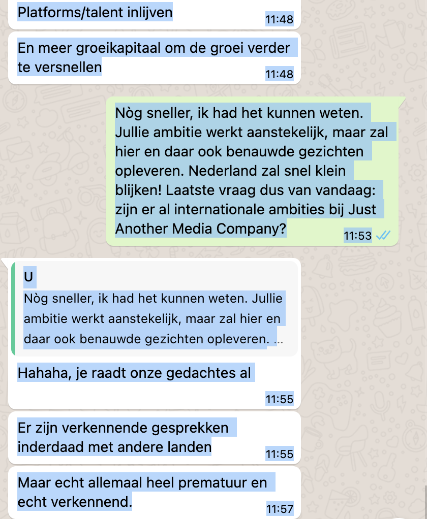 Nòg sneller, ik had het kunnen weten. Jullie ambitie werkt aanstekelijk, maar zal hier en daar ook benauwde gezichten opleveren. Nederland zal snel klein blijken! Laatste vraag dus van vandaag: zijn er al internationale ambities bij Just Another Media Company?