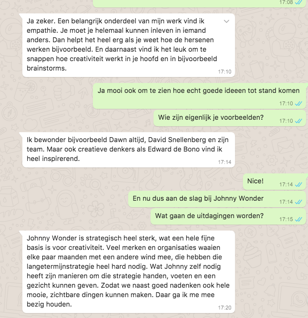 Johnny Wonder is strategisch heel sterk, wat een hele fijne basis is voor creativiteit. Veel merken en organisaties waaien elke paar maanden met een andere wind mee, die hebben die langetermijnstrategie heel hard nodig. Wat Johnny zelf nodig heeft zijn manieren om die strategie handen, voeten en een gezicht kunnen geven. Zodat we naast goed nadenken ook hele mooie, zichtbare dingen kunnen maken. Daar ga ik me mee bezig houden.