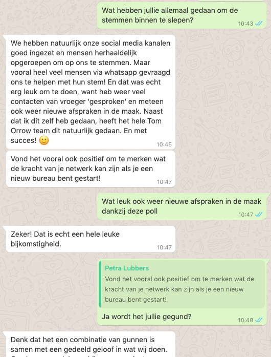 ons te stemmen. Maar vooral heel veel mensen via whatsapp gevraagd ons te helpen met hun stem! En dat was echt erg leuk om te doen, want heb weer veel contacten van vroeger 'gesproken' en meteen ook weer nieuwe afspraken in de maak. Naast dat ik dit zelf heb gedaan, heeft het hele Tom Orrow team dit natuurlijk gedaan. En met succes! Wat leuk ook weer nieuwe afspraken in de maak dankzij deze poll