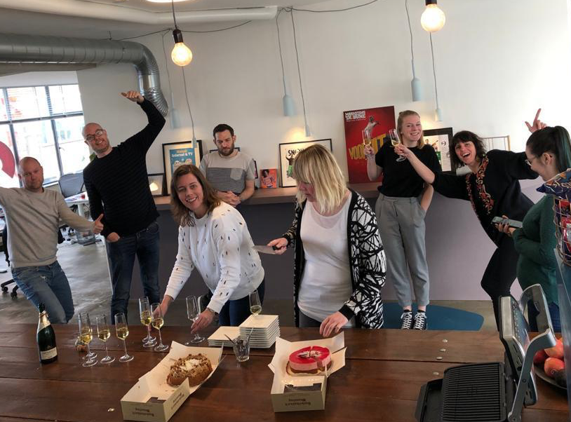 feestje gevierd op kantoor?Nou, eigenlijk zit iedereen te wachten totdat ik klaar ben. De taart en champagne staat namelijk op tafel!