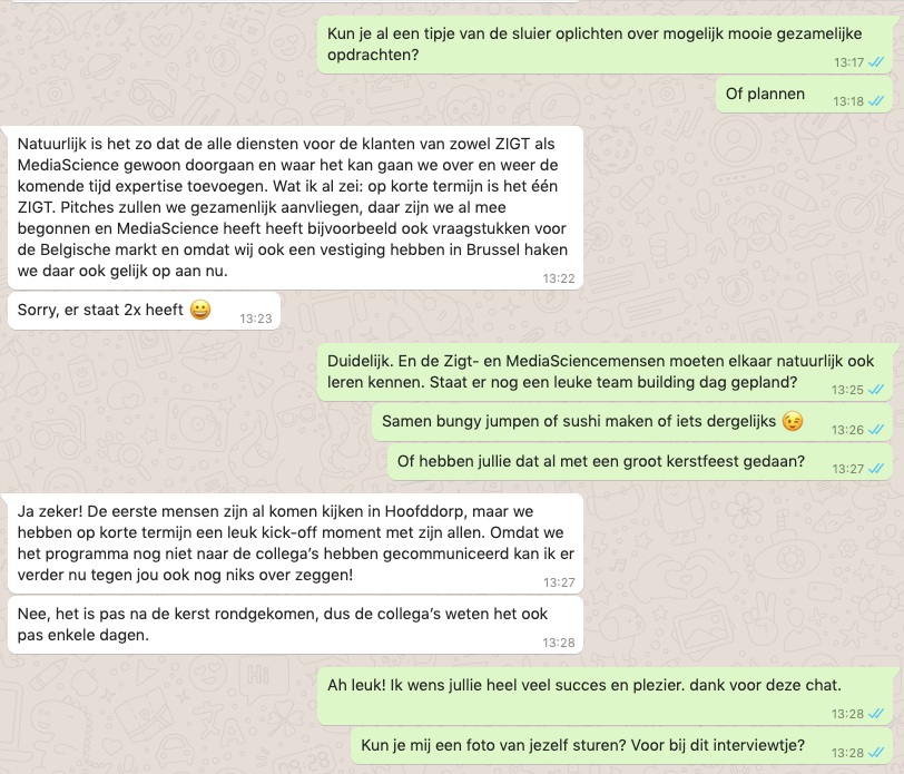 Het moet ook gezellig worden, de sfeer bij beide bedrijven is goed, dus dat moet goed komen. De naam MediaScience zal worden afgebouwd, we gaan vanuit 1 label opereren en dat zal ZIGT zijn. Er zit veel overlap in diensten, dus dat kunnen we sterker doen vanuit één entiteit.