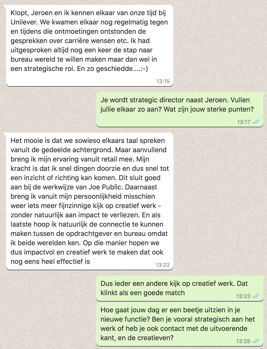 Klopt, Jeroen en ik kennen elkaar van onze tijd bij Unilever. We kwamen elkaar nog regelmatig tegen en tijdens die ontmoetingen ontstonden de gesprekken over carrièrewensen etc. Ik had uitgesproken altijd nog een keer de stap naar bureau wereld te willen maken maar dan wel in een strategische rol. En zo geschiedde....:-)