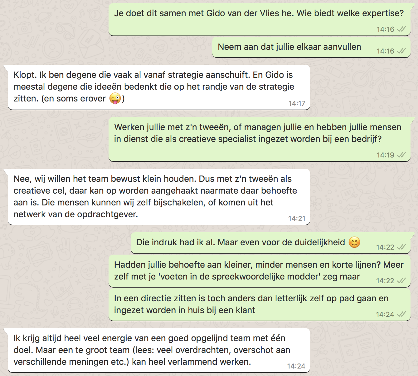 Klopt. Ik ben degene die vaak al vanaf strategie aanschuift. En Gido is meestal degene die ideeën bedenkt die op het randje van de strategie zitten. (en soms erover