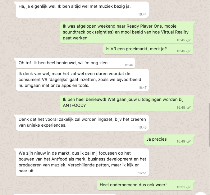 Hi Steve, Alexander van FONK Magazine hier! Gefeliciteerd met je nieuwe rol bij ANTFOOD! Zou ik je daar vandaag over mogen interviewen volgens ons WhatsApp format?
