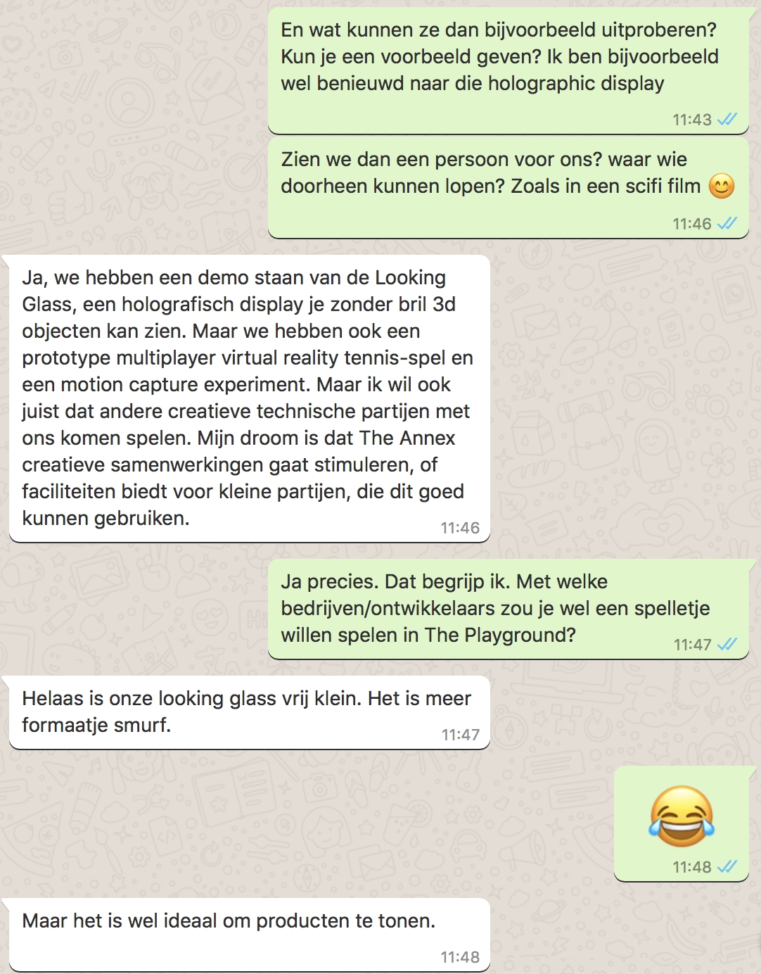 Ja, we hebben een demo staan van de Looking Glass, een holografisch display waarmee je zonder bril 3d objecten kan zien. Maar we hebben ook een prototype multiplayer virtual reality tennis-spel en een motion capture experiment. Maar ik wil ook juist dat andere creatieve technische partijen met ons komen spelen. Mijn droom is dat The Annex creatieve samenwerkingen gaat stimuleren, of faciliteiten biedt voor kleine partijen, die dit goed kunnen gebruiken.