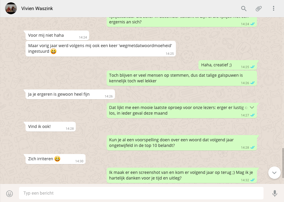 Vandaag werd ‘genderneutraal’ verkozen tot irritantste woord van het jaar. Het lijkt de bevestiging van een trend waarin mensen taalgebruik rond maatschappelijk beladen onderwerpen al snel zat zijn. Toen de Weg met dat woord verkiezing begon, was er meer ergernis over taalkundig onnodig of verkeerd gebruikte woorden. Een goede reden om eens te WhatsAppen over taal met Vivien Waszink, van het Instituut voor de Nederlandse Taal.