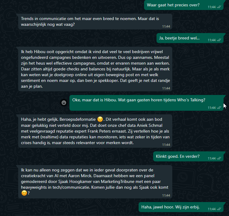 Ik kan nu alleen nog zeggen dat we in ieder geval doorpraten over de creatiekracht van AI met Aaron Mirck. Daarnaast hebben we een panel gemodereerd door Sjaak Hoogkamer van MarketingTribune met een paar heavyweights in tech/communicatie. Komen jullie dan nog als Sjaak ook komt?
