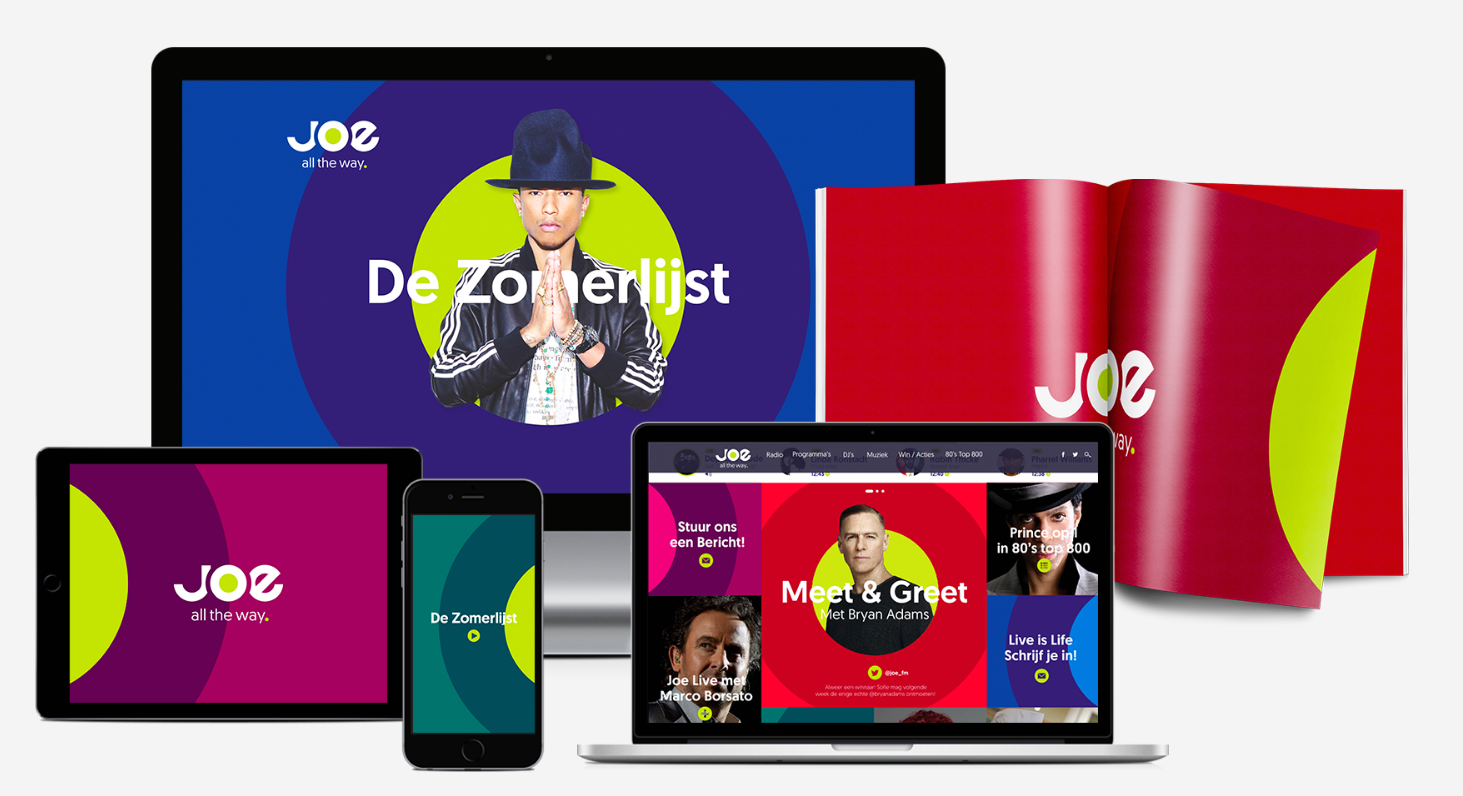 markt te behouden. Joe is als merk persoonlijk en dichtbij, en speelt met haar muziekkeuze in op het ritme van de dag. Op de zender worden alle ins-en-outs over muziek, nummers en artiesten besproken en met een playlist die varieert van all-time greatest hits tot instant classics vormt het merk een muzikale inspiratiebron voor haar publiek.Om de grootste artiesten en beste muziek visueel te claimen, heeft CapeRock een identiteits-systeem ontworpen, waarin deze door gebruik van de O van Joe in de spotlight worden gezet. De kleur lemon lime groen creëert een visueel onderscheid in de markt en is een visuele link naar de heritage van het merk. Binnen het identiteitssysteem wordt met verschillende kleurencombinaties gewerkt.