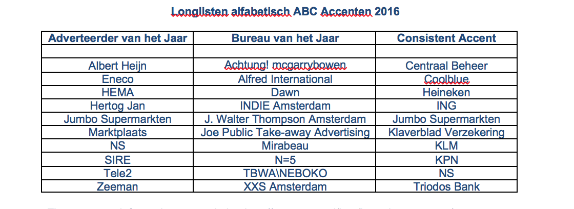 De ABC jury bestaande uit redacteuren van de Adformatie, Fonk, MarketingTribune en Tijdschrift voor Marketing, bestuursleden van de BvA (Bond van Adverteerders) en bestuursleden van de SAN, aangevuld met twee externe deskundigen, de volgende kandidaten genomineerd: