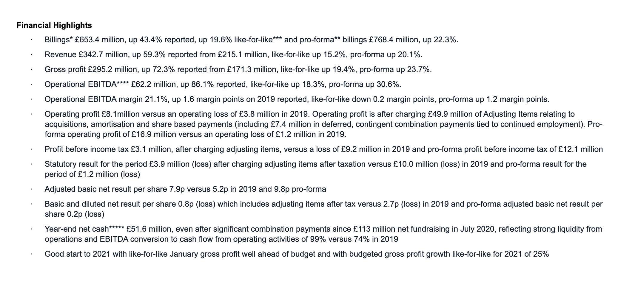 We continued to grow our top line and bottom line at industry leading rates, despite covid-19 and exhibited agility in developing new content revenue streams quickly, such as robotic production, animation and on-line events and driving data & digital marketing net revenues, particularly in the fourth quarter and into this year. We continued to broaden and deepen our Content and Data & digital media practices through organic growth and by the addition of a further four Content and six Data & digital media companies in 2020 and so far in early 2021. We further integrated our unitary client offering around our Content and Data & digital media practices. We broadened and deepened our client roster. We embraced the diversity, equity and inclusion and ESG opportunities and challenges with unique black-orientated fellowship and female executive leadership programmes, changed hiring practices and education programmes and made zero carbon commitments targeting 2024. We achieved double $ and £ Unicorn status in terms of stock market value, in only our second full year, while strengthening our balance sheet to take advantage of short-term opportunities.