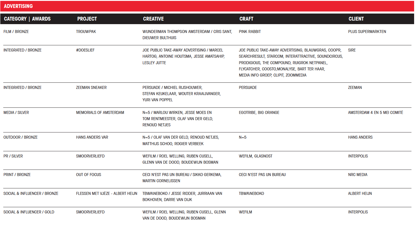 19 in Craft and 6 in Next. Er waren 2 gouden Lampen, 11 zilveren Lampen en 39 bronzen Lampen (naast de ADCN Members Award en Grand Prix). Veel Lampen gingen dit jaar naar projecten waar bedrijven en instanties met hun merken en creativiteit samenwerken aan maatschappelijke vraagstukken.Studio Dumbar en Exterion Media wonnen een gouden Lamp – in Design – met DEMO, het motion design festival waar creatief talent van over de hele wereld hun werk gedurende 24 uur heeft tentoongesteld op de digitale schermen van het Centraal Station in Amsterdam.