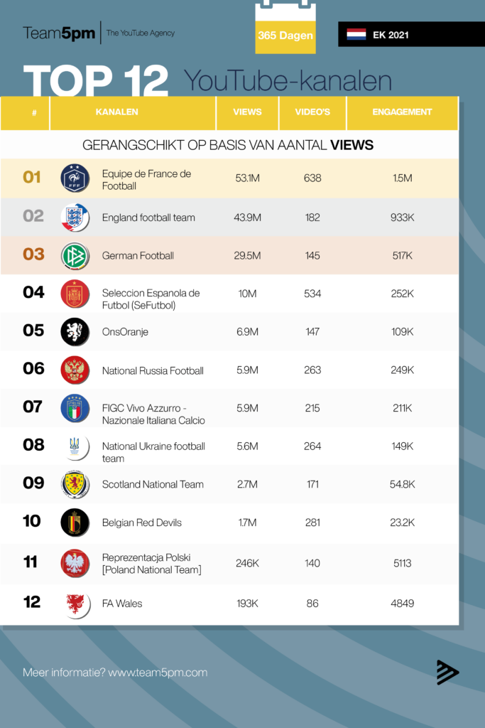 In Team5PM's nieuwste leaderboard wordt gekeken naar hoe de teams die deelnemen aan het Europees Kampioenschap de afgelopen 365 dagen hebben gepresteerd op YouTube. De leaderboards zijn gebaseerd op het aantal views, video’s en engagements op YouTube. Wie beheerste het YouTube-algoritme en heeft YouTube’s potentieel optimaal gebruikt?