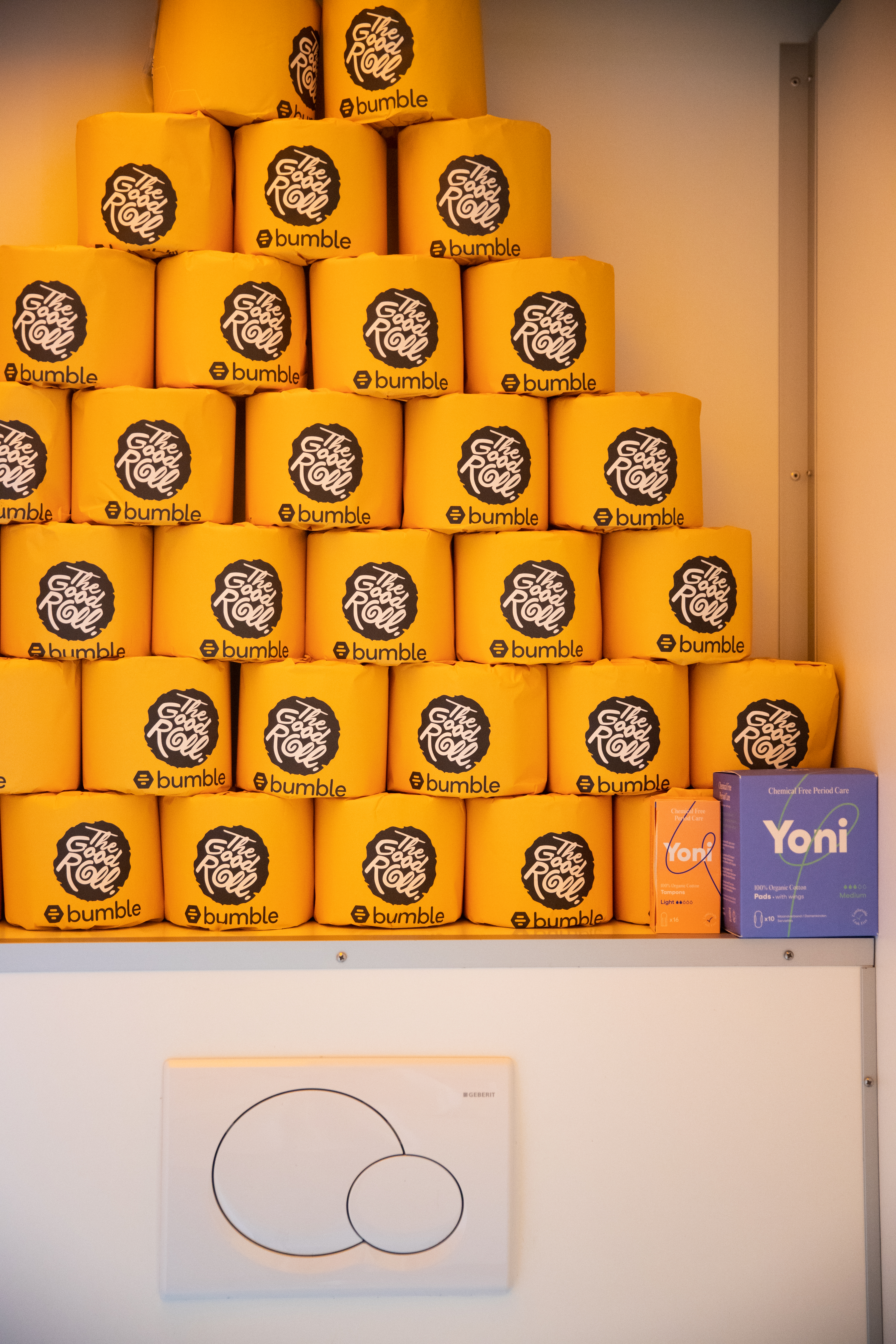 Te midden van al het oranje bood Bumble Bathroom op deze dag drie vrouwelijke openbare toiletten in de stad. Bumble is gebouwd op het belang van gelijkwaardige relaties en hoe cruciaal deze zijn voor een gezond en gelukkig leven. Ze hebben hun platform opgebouwd rond vriendelijkheid, respect en gelijkheid - ook te zien aan hun aanbod van The Good Roll