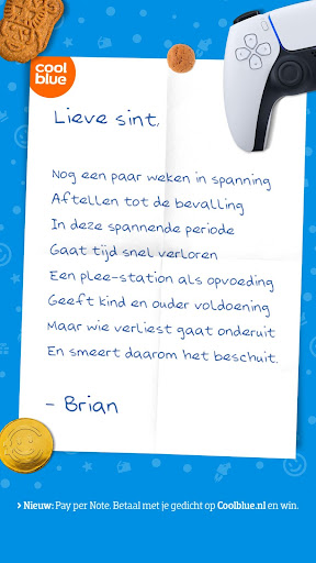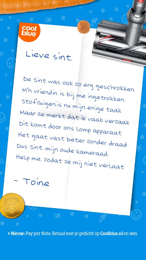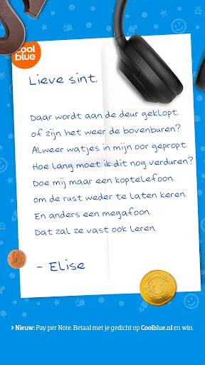 Coolblue heeft een geniale tool-campagne gelanceerd, die perfect aansluit op de Sinterklaastijd: de Pay-per-note. Door gedichten te schrijven naar de Sint over wat je zou willen hebben, maak je kans dat cadeautje daadwerkelijk te krijgen. 100 dichters worden uiteindelijk uitgekozen.