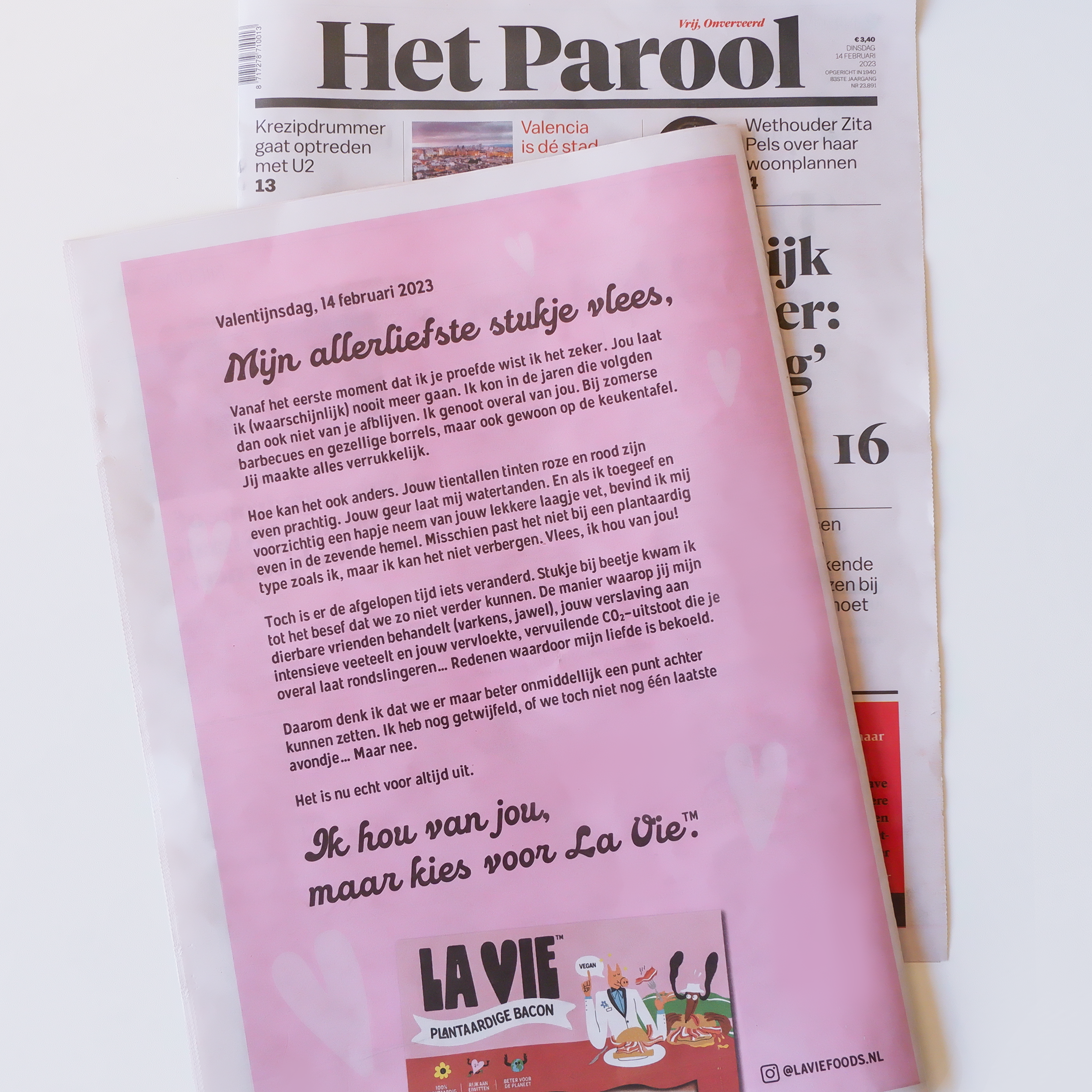 Tegelijkertijd is de brief een ode aan de ontzettend lekkere smaak van vlees. Wie geen vlees wil eten (en varkens wil sparen) maar de smaak niet kan missen, kan zich tegoed doen aan de plantaardige bacon van La Vie, dat net zo lekker is.
