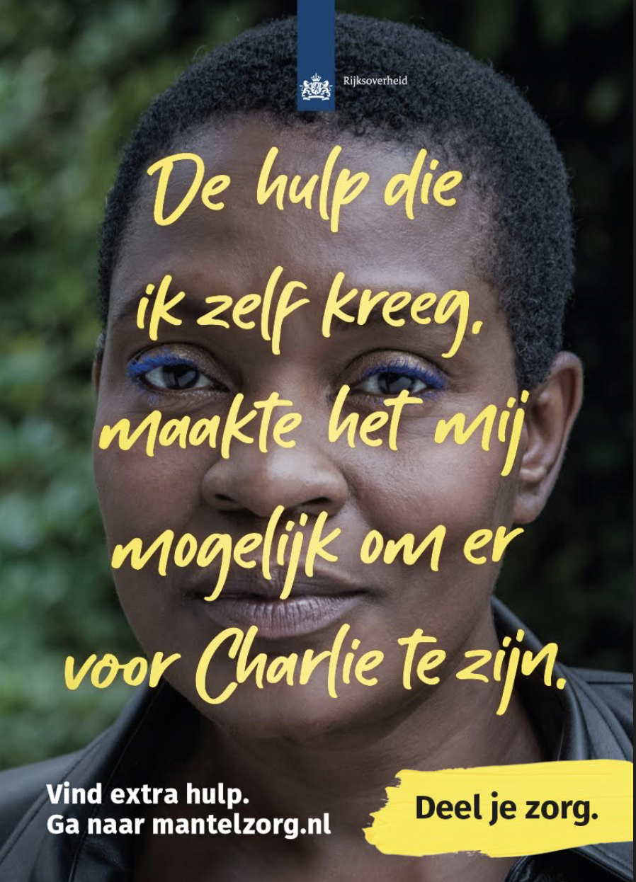 De tv-commercial wordt ondersteund door persoonlijke verhalen van mantelzorgers. In posters, banners en social video’s vertellen zij hoe en met wie zij hun zorg delen, en geven ze hun beste tips. Onder deze mantelzorgers bevinden zich ook BN’ers als cabaretier Jörgen Raymann, actrice Romana Vrede en 3FM DJ Frank van der Lende. Want met 4,4 miljoen mantelzorgers hoeft niemand het wiel zelf uit te vinden.
