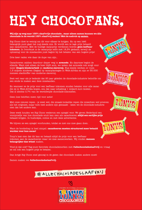 Tony’s eerste billboard-campagne in Nederland gaat gepaard met een paginagrote advertentie in de Volkskrant. Ook in winkels en online is de actie te zien. Op de billboards wordt gehint naar een aantal iconische smaken die samen symbool staan voor de hele chocolade-industrie waarin de norm moet veranderen: elke boer verdient een leefbaar inkomen, als belangrijke stap om een einde te maken aan misstanden in de industrie. Eerder maakte Tony’s al lookalike-versies van deze smaken om de chocolade-industrie te inspireren om in actie te komen. Tony’s roept daarnaast chocofans door heel Nederland op om hun favoriete chocolademerken te vragen om óók een leefbaar inkomen te betalen, door gebruik te maken van #allechocoladeslaafvrij.