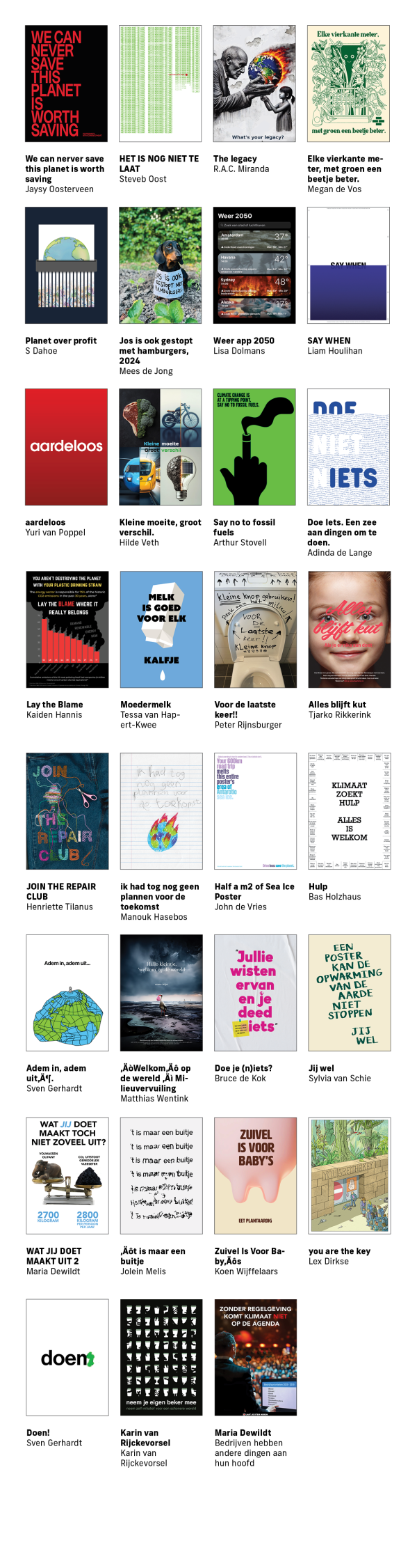 Met vijftienhonderd inzendingen voor de ontwerpwedstrijd Posters for the Planet – die openstond voor ontwerpers, kunstenaars en iedereen met een goed idee voor een klimaatcampagne – lieten Nederlanders massaal van zich horen. De inzendingen zijn afgelopen week beoordeeld door een onafhankelijke vakjury. Zij selecteerden 31 posters voor de longlist die vandaag is gepubliceerd.
