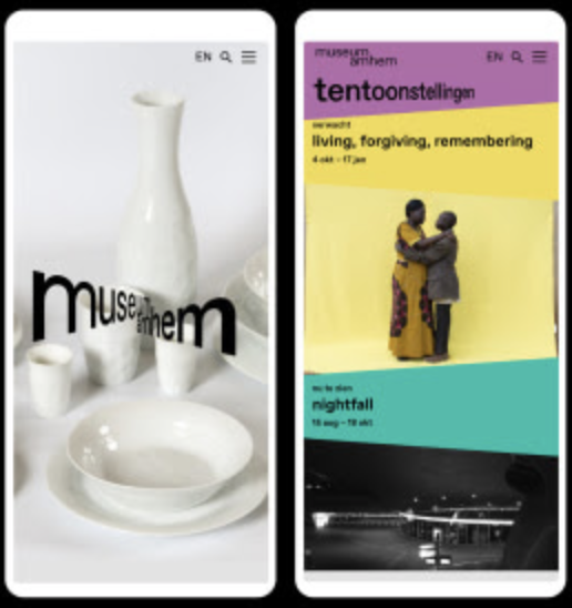 een afgewogen letterbeeld waarbij de laatste m van museum resoneert met de r en de n van arnhem’, vertelt Nikki Gonnissen, een van de twee directeuren van Thonik. ‘In deze variant van het logo zit een echo van de architectuur van de nieuwe vleugel van het museum. Het overhangende deel over de Rijnwal linkt aan de manier waarop het woord ‘museum' vast zit aan het woord ‘arnhem’.Vanuit het logo ontstaan vervolgens meerdere perspectivische letterbeelden, aldus Gonnissen. Zo verbeeldt de identiteit het engagement van het museum: vanuit verschillende perspectieven worden kunst en samenleving met elkaar verbonden. En zoals de letters van het logo in perspectief worden gezet, wordt ook het programma in woord en beeld vervormd. Een eenheid in de communicatie wordt gecreëerd door ee kleurenpalet van paars, steen oranje, warm geel en een turquoise groen.